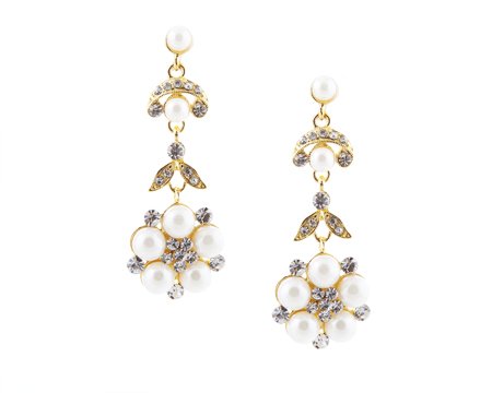 Chandelier Ivory Pearl, Beginning with a single, simple pearl, these dangling earrings branch out to a larger, bolder statement. That single pearl is followed by gold accented in small clear crystals, leading to another pearl of the same shape. At the base, four more pearls create a cluster with sparkling clear crystals to form an abstract flower, moving perfectly in the light. Length: 2.25 inches long Clasp: Pierced Post 7mm This is a great bridal earring. It goes well with any ivory dress with a some pearls and especially ones with a flower pattern. The earrings are long enough to be noticed but not take away from the bride.